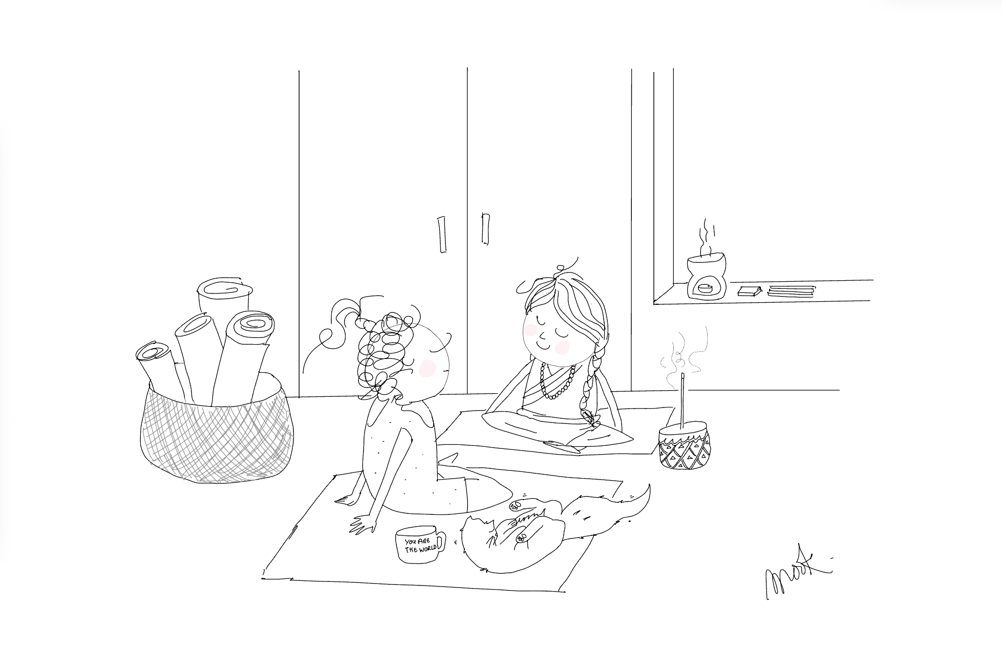 All artworks are hand illustrated on iPad, and all words are her own. This website is custom built, with an Anthropic AI companion as part of the experience.